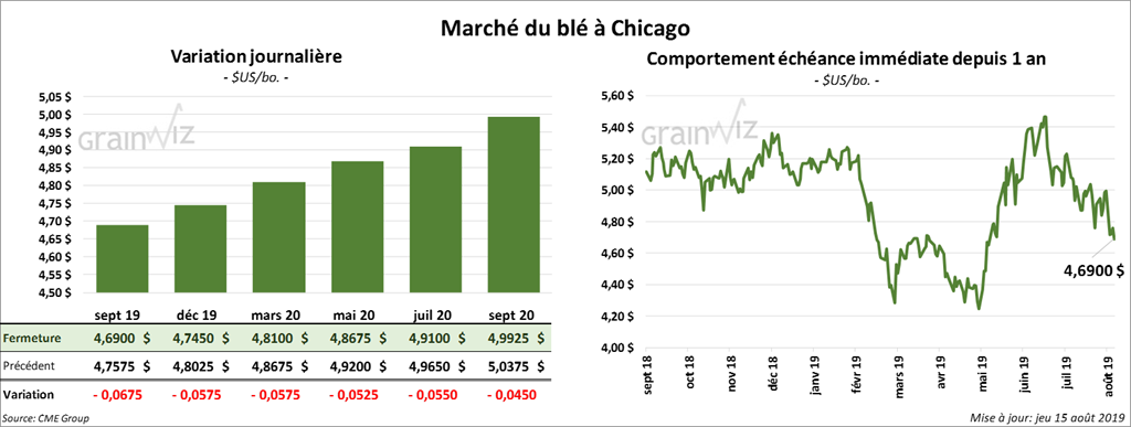 Les contrats de blé US ont fini la journée sur une note partagée. À Kansas, les contrats aux échéances les plus rapprochées ont clôturé en hausse de 5 cents. À Chicago, la baisse a été de 4 ¾ cents et à Minneapolis, de 2 ¾ cents.