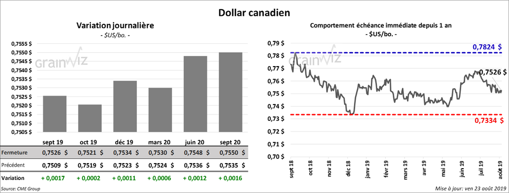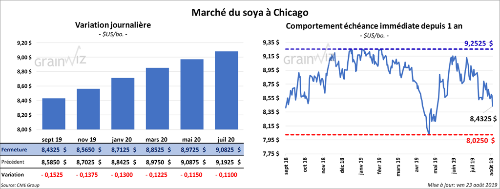 La Chine a annoncé une augmentation de 5 % des tarifs sur les importations de soya US, ce qui devrait les pousser à un total de 30 % le 1er septembre prochain. Cette mesure ne devrait pas faire de différence pour les compagnies privées chinoises qui ont déjà arrêté d’acheter du soya US. Par contre, les acheteurs gouvernementaux (exemptes de tarifs) devraient continuer d’effectuer quelques achats du soya US. En réaction à ce changement de la part des Chinois, le Président Trump a annoncé cet après-midi qu’il allait augmenter les tarifs sur les importations de produits chinois de 5 % à un total de 30 %. Cette mesure entrera en vigueur le 1er octobre prochain et touchera l’équivalant de 250 milliards de dollars US en produits chinois déjà frappés par des tarifs à l'importation. D’autres tarifs sur 300 milliards de dollars US en produits chinois seront mis en place le 1er septembre et ils devraient varier entre 10 et 15 %.