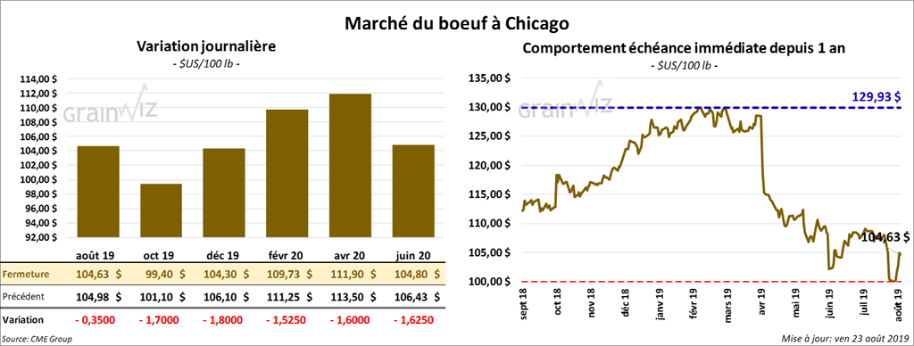 Le contrat de bœuf US août 19 a clôturé en baisse de 35 cents. Celui octobre 19 a reculé de 1,70 $. La plupart des contrats de veau ont également terminé en recul de 1,05 $ à 3,175 $.