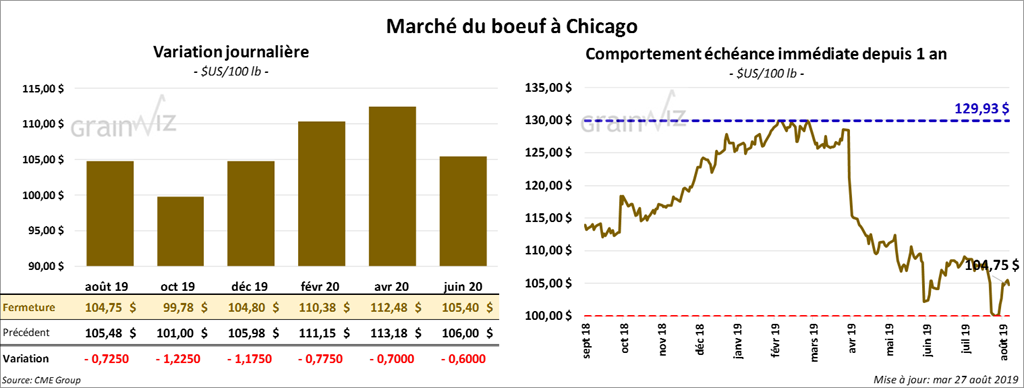 La majorité des contrats de bœuf US ont fini la session en baisse de 60 cents à 1,225 $. Les contrats de veau ont aussi terminé dans le rouge de 92,5 cents à 2,225 $. Le contrat août 19, qui devrait expirer bientôt, a reculé de 10 cents.