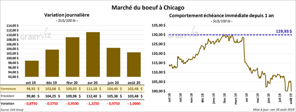 Le 29 août dernier, le CME feeder cattle index était en hausse de 14 cents à 138,55 $. Cet après-midi, la valeur du surgelé a été en baisse. La découpe «Choice» a perdu 42 cents à 231,77 $. Celle «Select» a également reculé de 51 cents à 212,27 $.