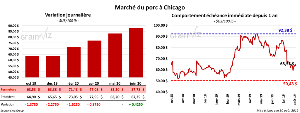Les contrats de porc US aux échéances les plus rapprochées ont terminé la session en baisse de 1,375 $ à 2,275 $.