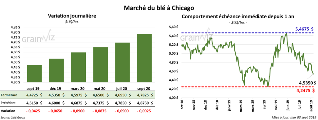 Les exportations de blé US continuent leur bonne progression. Dans la semaine du 29 août dernier, les inspections à l’exportation ont été de 526,049 tonnes, ce qui est une hausse de 4,26 % par rapport à la semaine précédente et de 28,55 % comparativement à la même période l’an passé.
