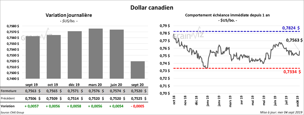 Ce matin, le Census Bureau a présenté ses nouvelles données. Il estime que 2,882 millions de tonnes de maïs US ont été exportées durant le mois de juillet dernier. Pour juillet, il s’agit du mois le plus faible depuis 2013. C’est aussi moins de la moitié du résultat de l’an passé et une baisse de 6,08 % par rapport à juin dernier. Le Census mentionne également que les expéditions de drèche US ont été de 834,515 tonnes, ce qui représente une diminution de 24,33 % comparativement à juillet 2018. La trituration a été en recul et l’usage domestique en hausse, alors que les prix du maïs US étaient en hausse. Par ailleurs, les exportations d’éthanol ont été un second record pour un mois de juillet avec 120,13 millions de gallons.
