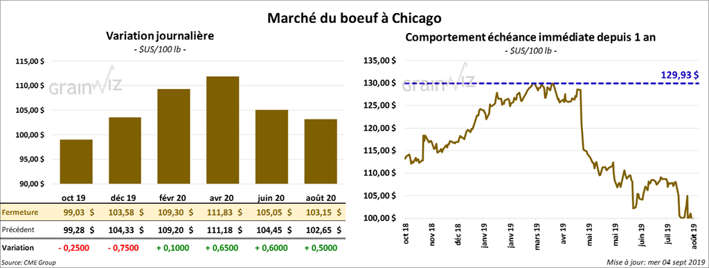 Le 2 septembre dernier, le CME feeder cattle index était en baisse de 25 cents à 138,84 $. Cet après-midi, la valeur du surgelé a été dans le rouge. La découpe «Choice» a perdu un cent à 230,65 $. Celle «Select» a fait reculé de 2,67 $ à 208,95 $.