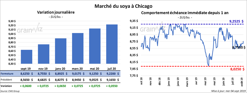 Les contrats de soya US aux échéances les plus rapprochées ont fini la journée avec des gains de 6 à 7 cents. Le tourteau a également clôturé dans le vert par 4,20 $/tonne. Par contre, l’huile a reculé de 8 points.