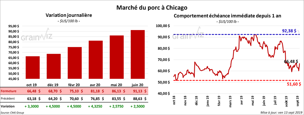Les contrats de porc à Chicago ont terminé la journée avec des gains élevés. Le contrat décembre 19 et celui février 20 ont même dépassé leurs limites à la hausse. Sur la semaine, le contrat octobre 19 a progressé de 4,69 %.