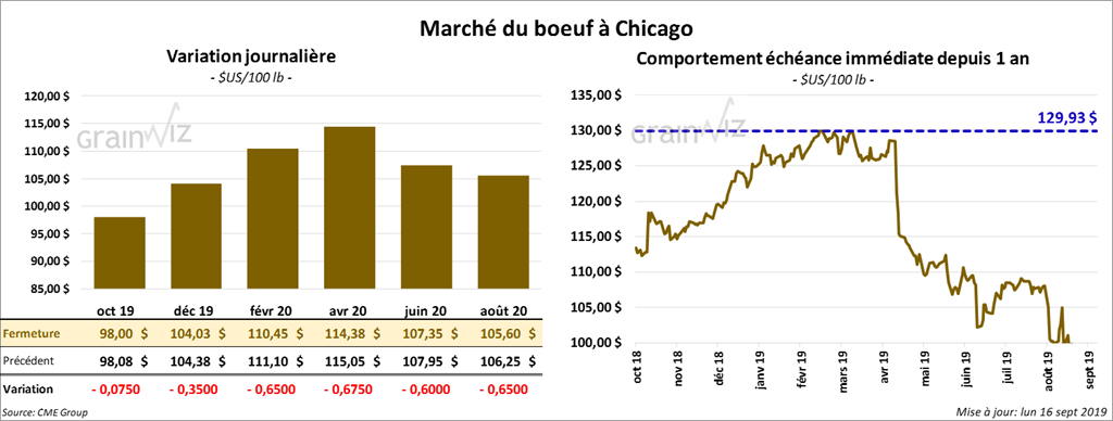 Les contrats de bœuf US aux échéances les plus rapprochées ont fini la journée en baisse de 7,5 à 65 cents. Les contrats de veau US ont également reculé de 35 à 85 cents. Le contrat septembre 19 a pris 5 cents.