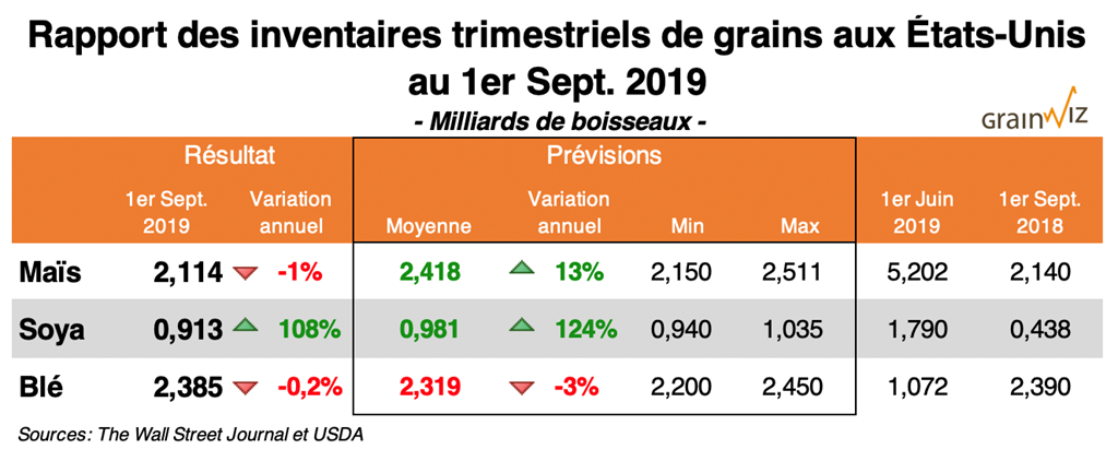 Le USDA a publié ce midi son rapport sur les stocks trimestriels de grains américains au 1er septembre dernier. Ce rapport est d'autant intéressant qu'il permet de réajuster le tir sur les stocks de début d'année de maïs et soya américain pour la nouvelle année commerciale qui débute (2019-20).