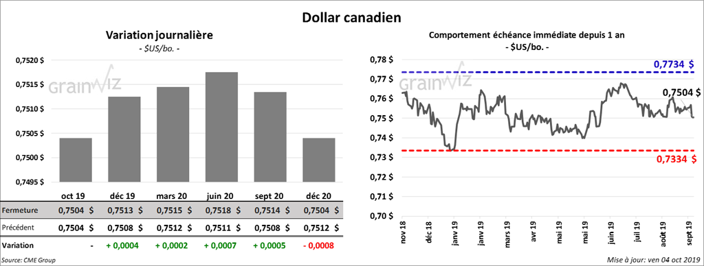 Ce matin, le rapport du Census Bureau indiquait que les exportations de blé US ont été de 2,57 millions de tonnes au cours du mois d’août dernier, ce qui représente une hausse de 32,48 % par rapport au mois précédente et de 23,05 % comparativement à la même période en 2018. Le résultat est également le plus élevé des 3 dernières années. Les engagements à l’exportation de blé US sont actuellement à 49 % par rapport à la projection du USDA pour l’année commerciale 2019/2020. La normale est de 56 %.