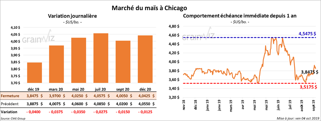 Les contrats de maïs à Chicago ont terminé la semaine avec des gains de 3,57 %. Pour la journée, le contrat décembre 19 a progressé de 3,85 $.