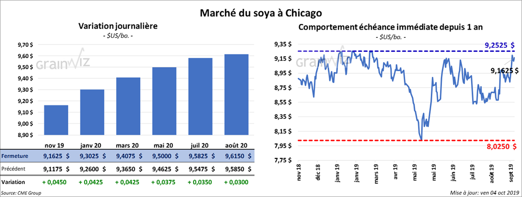 Le contrat de soya US novembre 19 a terminé la journée à la hausse de 4 ½ cents. Sur la semaine, il a progressé de 3,77 %. Le tourteau a clôturé dans le vert de 0,80 $/tonne. L’huile a perdu 1 point.