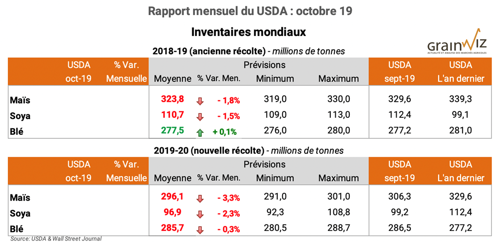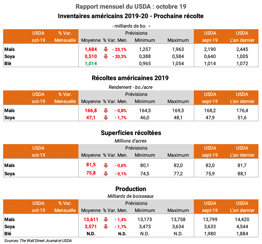 Voici le résumé des anticipations des marchés. Pour accéder au rapport lors de sa publication (en anglais): Wasde Oct 19