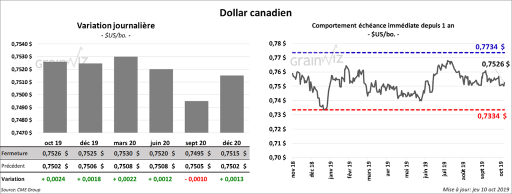 À l’échelle mondiale, le USDA estime que la production UE est en hausse de 1 million de tonnes à 152 millions de tonnes. Par contre, il évalue celle de l’Australie en baisse de 1 million de tonnes à 18 millions de tonnes. Globalement, les stocks mondiaux de fin d’année 2019/2020 sont en hausse de 1,29 millions de tonnes comparativement à septembre dernier à 287,8 millions de tonnes.