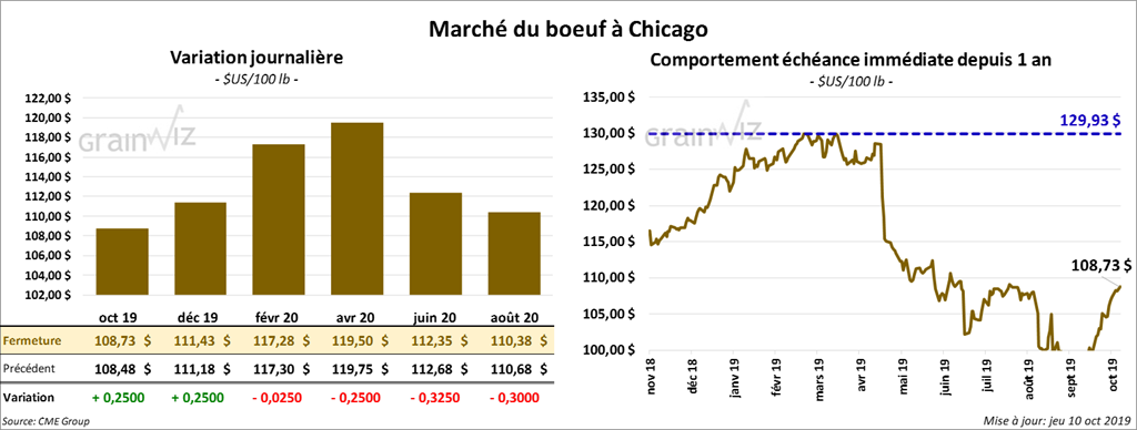 Le USDA a aussi estimé que la production de bœuf US 2019 est actuellement à 26,948 milliards de lbs, ce qui est une réduction de 5 millions de lbs par rapport à septembre dernier. Il projette une production de bœuf US 2020 à 27,670 milliards de lbs.