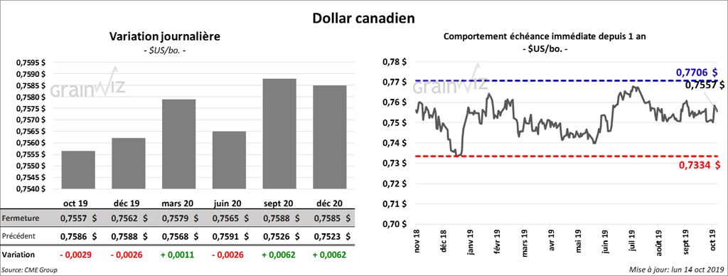 Pour le rapport sur la progression des cultures, qui sera présenté demain, le marché s’attend à ce que la récolte de maïs US en date du 13 octobre dernier soit terminée entre 22 et 23 %. La moyenne des années passées est de 35 %. Les conditions sèches des prochains jours qui affecteront certains endroits du Corn Belt devraient permettre la progression des activités aux champs. Par contre, des averses sont prévues dans le courant du week-end prochain.