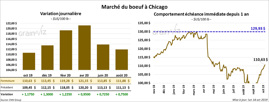 Le 11 octobre dernier, le CME Feeder Cattle Index était en hausse de 63 cents à 144,26 $. Cet après-midi, la valeur du surgelé a été en progression avec un «spread» qui s’est élargi à 27,89 $. La découpe «Choice» a gagné 1,56 $ à 217,22 $. Celle «Select» a suivi en prenant 65 cents à 189,33 $.