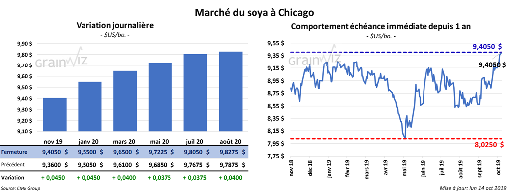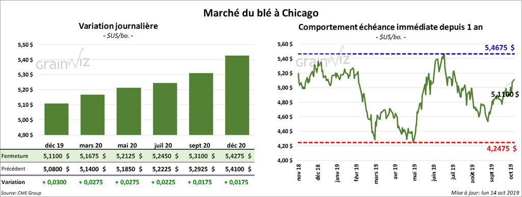 Les contrats de blé US ont fini la journée dans le vert. À Kansas, le blé dur rouge d’hiver a clôturé en hausse de 6 ¼ cents. À Chicago, le contrat de blé tendre rouge d’hiver décembre 19 a terminé la session avec des gains de 3 cents. À Minneapolis, le blé dur rouge de printemps a gagné 4 cents.