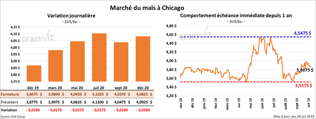 L’International Grain Council (IGC) estime les inventaires mondiaux de maïs 2019/2020 à la baisse par rapport à septembre dernier de 8 millions de tonnes à 278 millions de tonnes. La production mondiale ainsi que la consommation ont aussi été revues à la baisse respectivement de 1 million de tonnes.