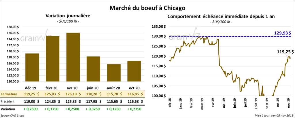 Les contrats de porc US février 2020 et avril 2020 ont terminé la session avec des gains de 12 à 17 cents. Le contrat décembre 19 a fini la journée en baisse de 17 cents. Sur la semaine, il a perdu 32 ½ cents.
