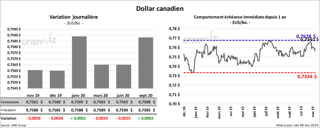 Le rapport mensuel sur la production des cultures du NASS a indiqué ce midi que les rendements de soya US 2019 sont demeurés les mêmes qu’en octobre dernier avec 46,9 bo./acre. La plupart des analystes s’attendaient à une légère réduction. Comparativement aux prévisions d’octobre dernier, les superficies récoltées en soya US 2019/2020 restent aussi les mêmes à 75,626 millions d’acres. Le USDA laisse inchangé son estimé de la production à 3,550 milliards de boisseaux. Les inventaires de fin d’année de soya US auraient augmenté de 15 millions de boisseaux à 475 millions de boisseaux. Le marché s’attendait à une baisse à 431 millions de boisseaux. Il y aurait également eu une réduction de soya US trituré. Mondialement, le rapport d’offre et de demande montre qu’il y a une hausse des stocks de soya supérieure aux anticipations du marché de 2,2 millions de tonnes comparativement à octobre dernier à 95,42 millions de tonnes.