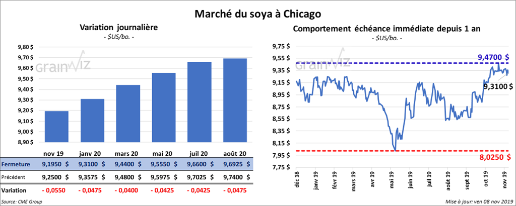 Sur la semaine, le contrat de soya US novembre 19 a perdu 4 ¾ cents. Par contre, pour aujourd’hui, ceux aux échéances les plus rapprochées ont terminé la session en baisse de 5 ½ cents.