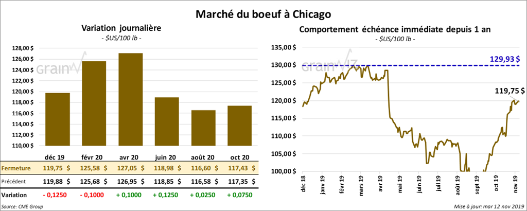 Les contrats de bœuf US ont terminé la journée sur une note partagée. Les contrats décembre 19 et février 20 ont perdu 10 à 12 cents, mais celui avril 20 a gagné 22 cents. Les contrats de veau US ont rebondi après avoir reculé ce midi pour finir la session avec des gains de plus de 22 cents.