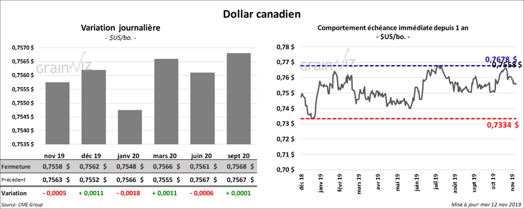 Cet après-midi, le USDA a présenté son rapport sur la progression des cultures en date du 10 novembre dernier. Dans le cas du soya US, l’avancement de la récolte était dans les attentes du marché à 85 %. La moyenne quinquennale est de 92 %, mais il n’y a que 2 % de moins que le résultat de l’an passé à la même période.