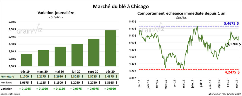 Les contrats de blé US ont clôturé en hausse. Les contrats de blé dur rouge d’hiver à Kansas ont gagné 16 cents. À Chicago, les contrats de blé tendre rouge d’hiver ont aussi terminé en hausse de 11 ¼ cents. À Minneapolis, les contrats de blé dur rouge de printemps ont progressé de 6 ½ cents.