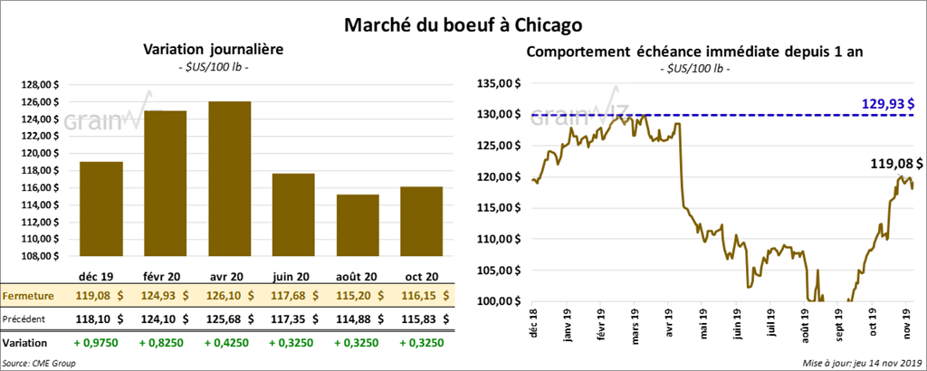 Le 13 novembre dernier, le CME Feeder Cattle Index avait reculé de 5 cents à 147,39 $. Cet après-midi, la valeur du surgelé était en baisse. La découpe «Choice» a perdu 1,28 $ à 241,06 $. Celle «Select» a reculé de 1,69 $ à 215,84 $.