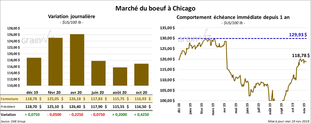 Les contrats de bœuf US ont remonté après le recul observé vers midi, mais la majorité d’entre eux ont tout de même clôturé en baisse. Le repli a été plus marqué pour le contrat avril 2020 qui a perdu 20 cents. Les contrats de veau US ont gagné 22 cents. Toutefois, les contrats janvier 2020 et mars 2020 ont perdu entre 25 et 45 cents.