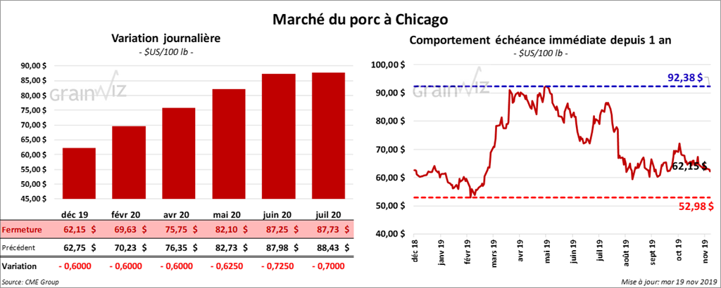 Le 15 novembre dernier, le CME Lean Hog Index était en baisse de 27 cents à 59,24 $. Cet après-midi, la valeur moyenne des découpes a été en recul de 4,47 $ à 84,67 $. Sur une base nationale, le prix moyen au comptant de la carcasse était en progression de 17 cents à 42,31 $.
