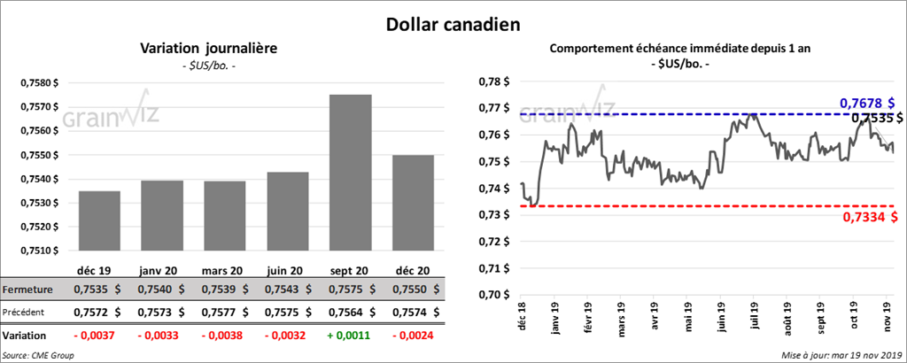 La base national moyenne du soya aux États-Unis est de -0,6265, ce qui porte la moyenne mensuelle à -0,6638 jusqu'ici. La tendance est de 13 jours consécutifs de base plus ferme, alors qu'au début du mois cette base était de -0,7292. À pareille date l'an dernier, pour le 19 novembre, la base était de -0,8881, et la moyenne à ce jour pour la base à ce moment-ci de -0,9827. Les prix FAB du soya US sont évalués entre ceux du Brésil et de l'Argentine, à 359 $US/tonne (environ 9,77 $US/bo.).