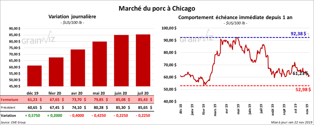 Les contrats de porc à Chicago ont terminé la journée sur une note partagée. Ceux décembre 19 et février 20 ont clôturé avec des gains de plus de 57 cents. Toutefois, les contrats aux échéances les plus éloignées ont fini la session avec des pertes de 22 à 42 cents. Sur la semaine, les contrats de porc US ont terminé dans le rouge de 1,97 ½ $.