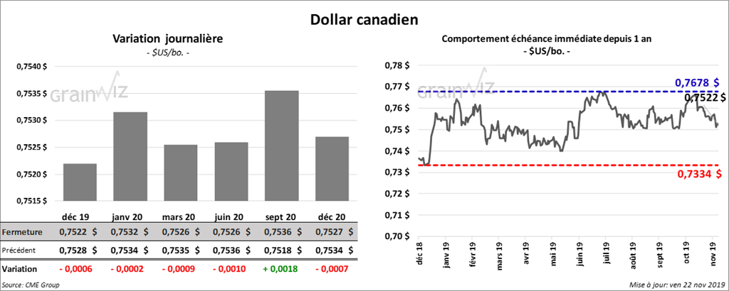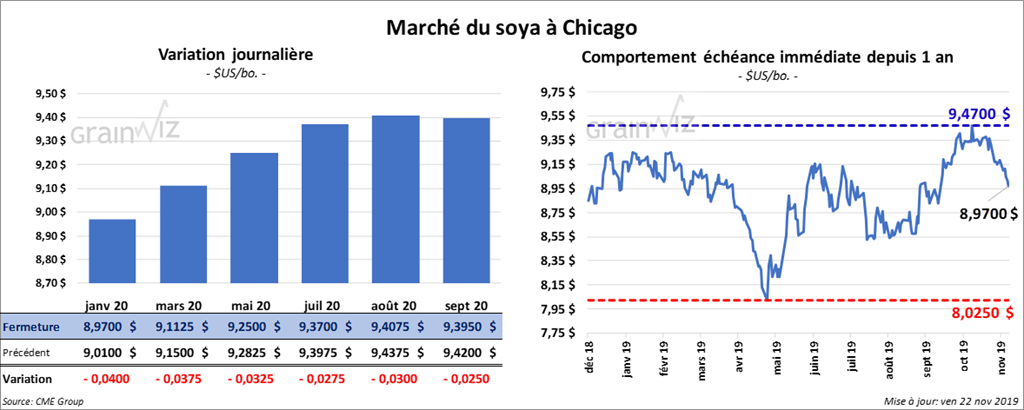 Pour la première fois depuis la fin septembre dernier, le contrat janvier 2020 a terminé la journée sous la barre des 9 $. Pour la semaine, les contrats de soya US ont perdu 21 ¼ cents. Le tourteau a fini la session en baisse de 2 $/tonne. Sur la semaine, il a reculé de 8,10 $. Par contre, l’huile a clôturé en hausse de 19 points.