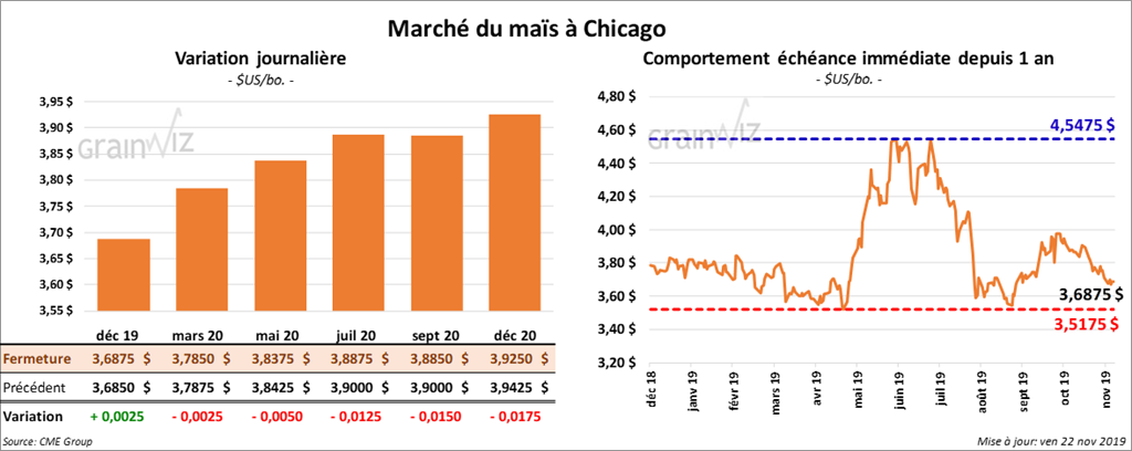 Les contrats de maïs US aux échéances les plus rapprochées ont terminé la session en baisse d’une fraction à 1 ½ cents.