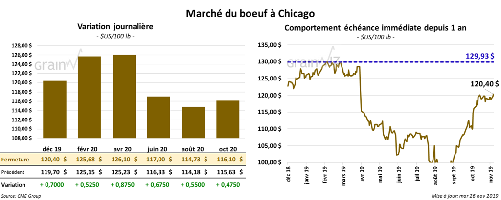 À la fermeture du marché, les contrats de bœuf US étaient en hausse de 52 à 87 cents. Le contrat décembre 19 a même touché son haut des 7 derniers mois. Les contrats de veau US ont principalement terminé la session en baisse de 35 cents. Toutefois, le contrat avril 2020 a fini avec des gains.