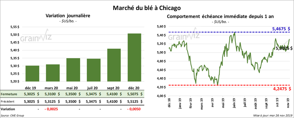 Sous la pression des prises de profits, les contrats de blé US ont terminé la journée en baisse. Ils ont clôturé dans le rouge de ¾ à 4 ¼ cents. À Chicago, les contrats de blé tendre rouge d’hiver ont reculé de ¾ à 1 ¾ cents. À Kansas, les contrats de blé étaient aussi dans le négatif. Ceux aux échéances les plus rapprochées ont baissé de 3 ¾ cents. À Minneapolis, les contrats de blé ont eu une progression partagée. Les contrats aux échéances les plus éloignées ont terminé en baisse de 4 ¼ cents. Par contre, les contrats mai-décembre 2020 ont fini la session sur une note positive.