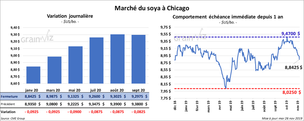 Les contrats de soya US aux échéances les plus rapprochées ont terminé la journée avec des pertes de 7 ¼ à 8 ¼ cents. Le tourteau a également clôturé dans le rouge de 3,60 $/tonne. L’huile a perdu 22 points.