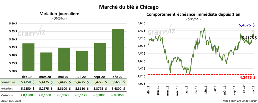 Pour le rapport sur les ventes à l’exportation de la semaine du 21 novembre dernier, celles de blé US ont été de 612,655 tonnes alors que les attentes des marchés étaient entre 300,000 et 600,000 tonnes. Il s’agit des ventes les plus élevées de 2019/2020. Pour l’année commerciale en cours, le total des engagements à l’exportation a augmenté de 8,97 % par rapport à l’an dernier à 16,427 millions de tonnes. Avec 27 semaines restantes, le cumulatif annuel des expéditions à l’exportation de tous les type de blé US est à la baisse de 26,60 % par rapport à l’an passé à 12,150 millions de tonnes.