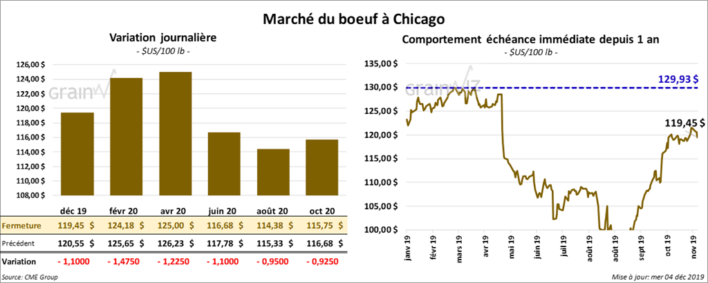 Les contrats de bœuf US ont clôturé en baisse par 3 chiffres. Les contrats décembre 19 jusqu’à février 19 ont perdu entre 1,10 et 1,47 $. Les options décembre 19 expireront vendredi. Les contrats de veau US ont aussi terminé dans le rouge par 3 chiffres. Globalement, ils ont reculé de 1,50 $.