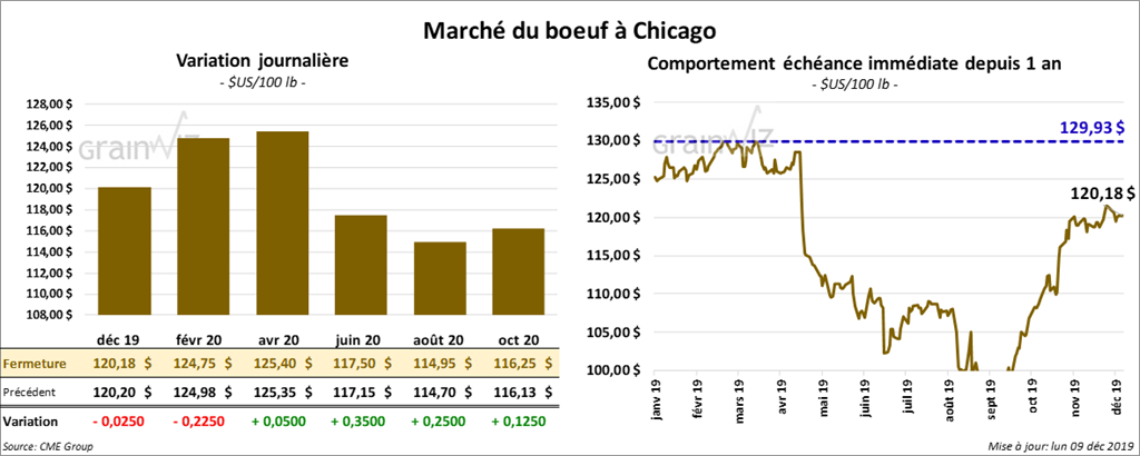 La majorité des contrats de bœuf US ont terminé la session en baisse. Le contrat avril 2020 a tout de même fini la journée en hausse de 10 cents. Le contrat de veau US janvier 2020 a clôturé en baisse, mais les autres contrats aux échéances les plus rapprochées ont terminé la session en progression de 60 cents.
