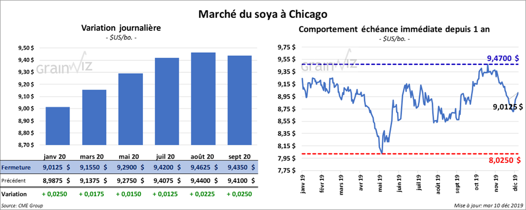 Les contrats de soya US aux échéances les plus rapprochées ont terminé la journée avec des gains de 2 ¼ à 3 cents. Pour une 6ème journée d’affilée, le contrat janvier 2020 est en hausse. Le tourteau a également clôturé dans le vert par 10 cents/tonne. L’huile a gagné 18 points.