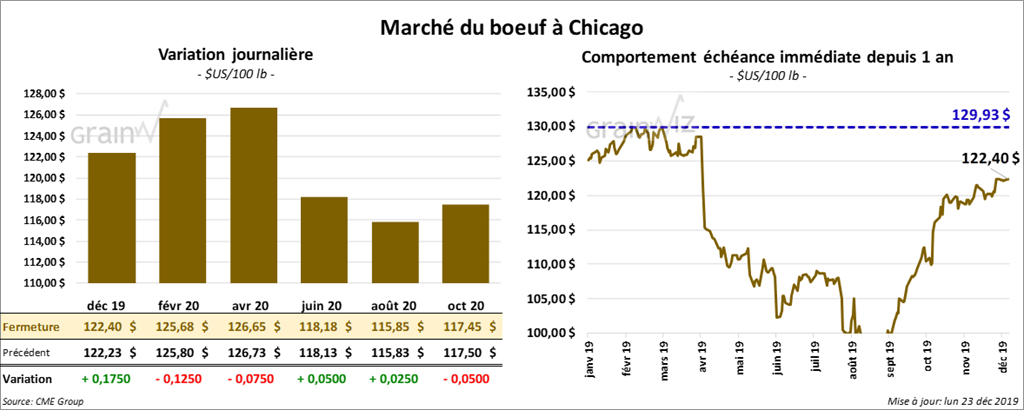 Le rapport Cattle-on-Feed présenté vendredi dernier a indiqué qu’en novembre dernier, les placements avaient augmenté de 4,86 % par rapport à la même période l’an dernier. Il a également montré qu’au 1er décembre dernier, la commercialisation avait baissé de 3 % comparativement à 2018. Les inventaires des parcs d’engraissement ont été évalués en hausse de 2,5 % par rapport à la même période en 2018 à 12,03 millions de têtes.