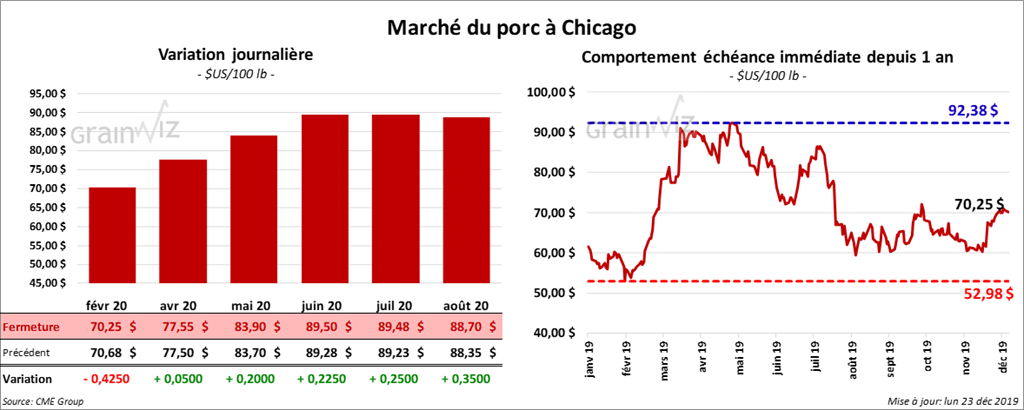 Même si les contrats de porc US ont récupéré des pertes de ce matin, ils ont clôturé sur une note partagée. La plupart d’entre eux ont gagné 20 cents, mais le contrat février 2020 a terminé en baisse de 20 cents.