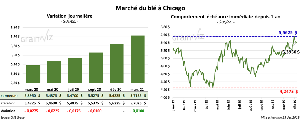En date du 19 décembre dernier, le BAGE a laissé inchangé son estimé de la production de blé argentin 2019/2020 à 18,5 millions de tonnes, avec une récolte terminée à 77,5 %.