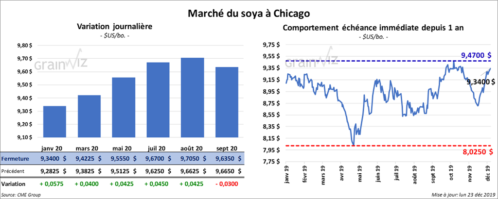 Dans son rapport sur les inspections à l’exportation de la semaine du 19 décembre dernier, le USDA estime que 1,084 million de tonnes de soya US ont été exportées, ce qui correspond à une baisse de 35,07 % par rapport à la semaine précédente, mais aussi à une augmentation annuelle de 54,92 %. Le cumulatif annuel est de 19,794 millions de tonnes, comparativement à 15,871 millions de tonnes au même point l’an passé.