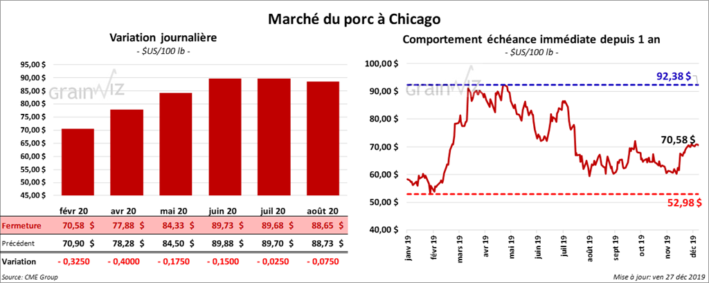 Les contrats de porc US aux échéances les plus rapprochées ont terminé la journée en baisse de 40 cents. Pour la semaine, le contrat février 20 a perdu 10 cents