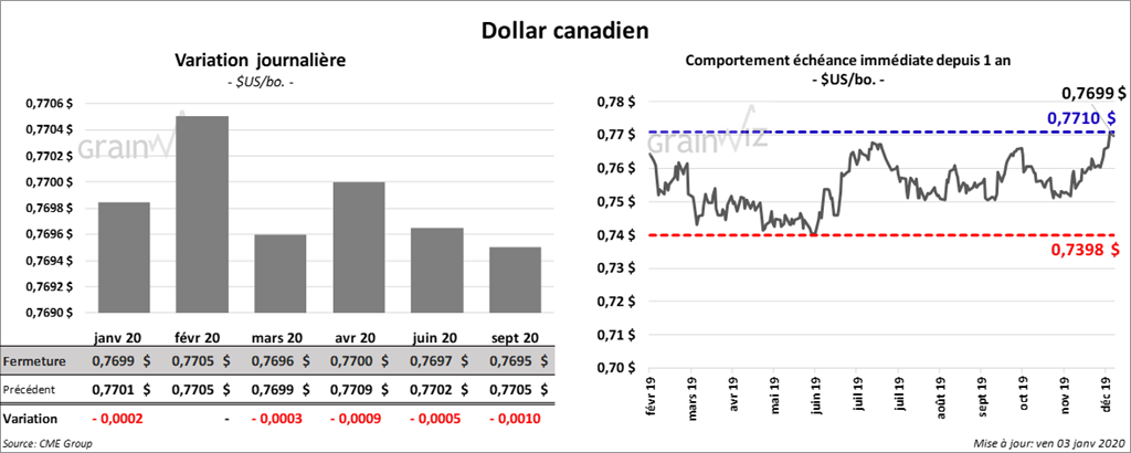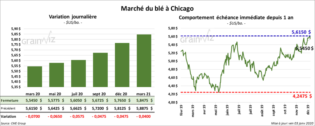 Ce matin, le rapport hebdomadaire sur les ventes à l’exportation de la semaine du 26 décembre dernier indiquait que celles de blé US ont été de 312,900 tonnes alors que les marchés s’attendaient à un résultat entre 250,000 et 800,000 tonnes. Il y a eu des ventes additionnelles de 20,350 tonnes pour l’année commerciale 2020/2021. En fait, les ventes ont baissé de 47,63 % par rapport à la même semaine en 2018. Les exportations hebdomadaires ont également été inférieures à celles de l’an passé avec seulement 339,293 tonnes expédiées. Le cumulatif annuel des expéditions reste tout de même supérieur à celui de l’an passé avec 14,149 millions de tonnes pour 2019/2020, ce qui correspond à une augmentation de 16,41 % par rapport à 2018/2019.