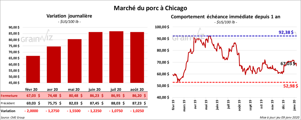 Les contrats de porc US ont fini la session dans le rouge de 1,27 à 2 $. Le contrat février 20 a le plus reculé.